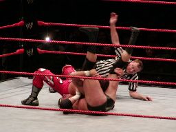 ショーンカバー、しかしHHHの足がロープにかかる。