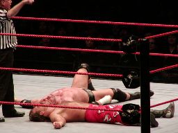 HHHの腕がだらりと下がる。しかしレフェリーのチェックが入る前に立ち上がる。