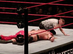 HHHはショーンを場外に落とす。ショーンエプロンから回転エビ固め。