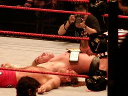 HHHはパンチ、この試合ダブルノックダウン。休憩後の2試合以外はすべてこういうシーンあり。