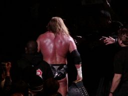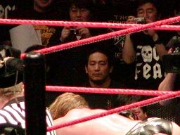 這ってリングを出るHHHとそれを見てる高木三四郎。