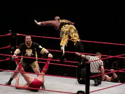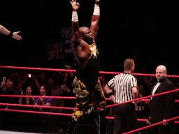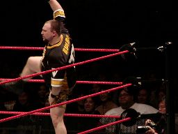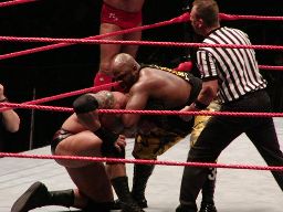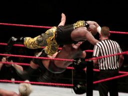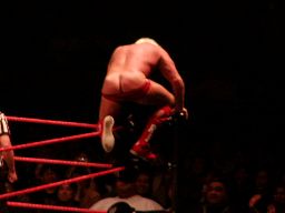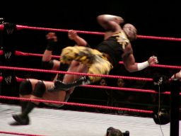 ババ・レイがコーナーに上って超重量級クロスボディ。