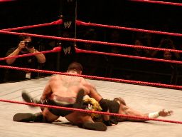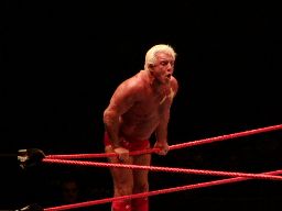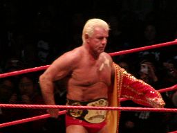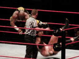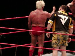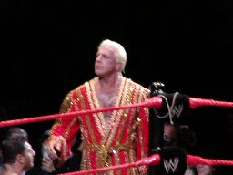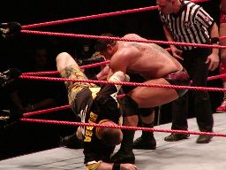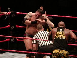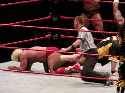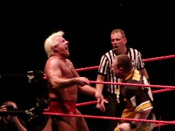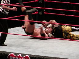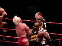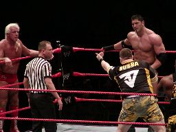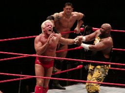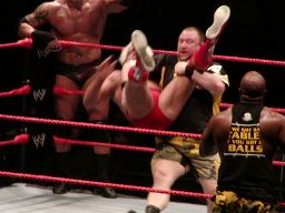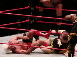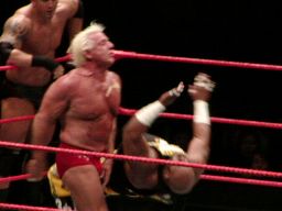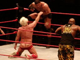 ババ・レイの後方からバティスタが足にクローズライン、これで形勢逆転、フレアーはババ・レイの足にニースタンプ連打、トーホールドに。