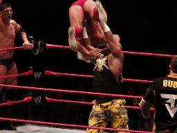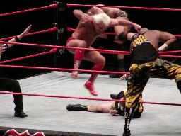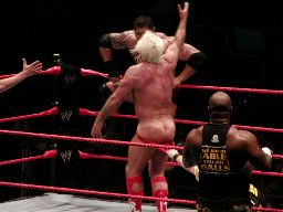 タッチに行こうとするフレアーのタイツをババ・レイがつかむ。フレアー半ケツ(というレベルではないな)