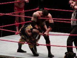 コーナーから助走をつけてのド迫力ロックアップを見せる巨漢の2人。