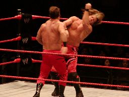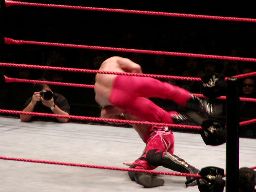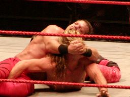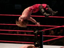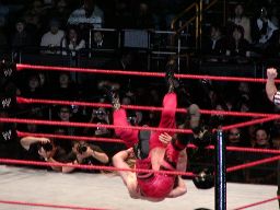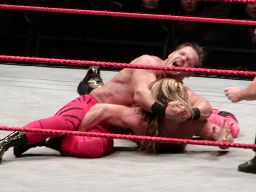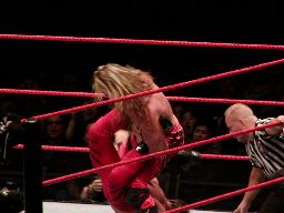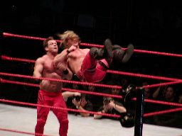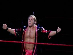 ジェリコはブレーンバスターの体勢からベノワをトップロープに叩きつける。ジェリコはコーナーに飛び乗って反転ミサイルキック、ベノワ場外転落。ジェリコも後を追い、客席前の鉄柵にぶつける。