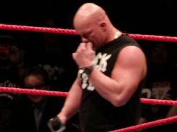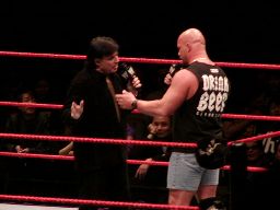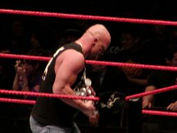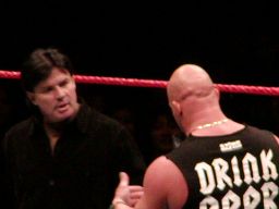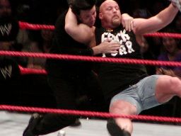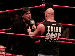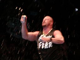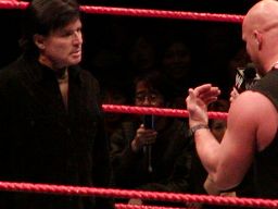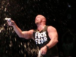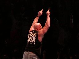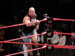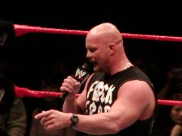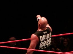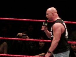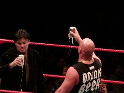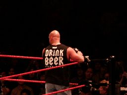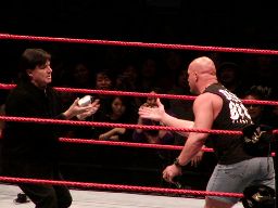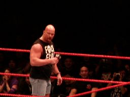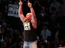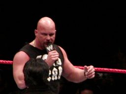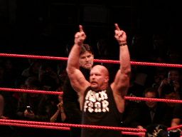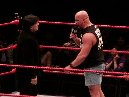 そこにガラス音。ストーンコールド・スティーヴ・オースチン入場。場内は最高の盛り上がり。