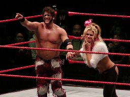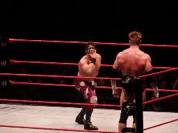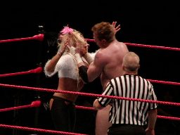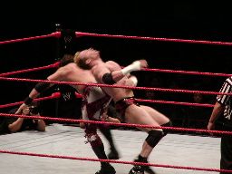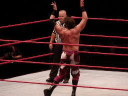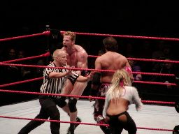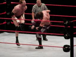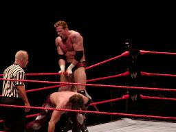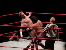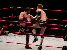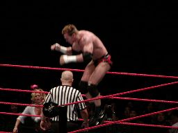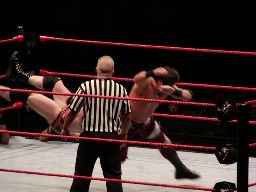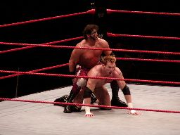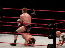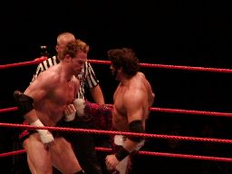 テストビッグブーツ、リコがかわすとテストは股間をトップロープでクロッチ。