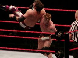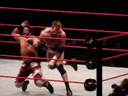 ロープに飛んでクローズライン。