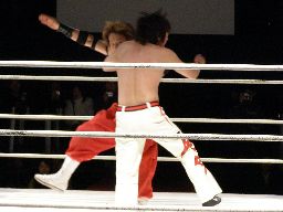チョップ合戦、ショルダーブロック合戦(右写真)、ロープワークから旭すくい投げで投げようとするが宮本ブロックしてショルダーブロック、両軍タッチ。