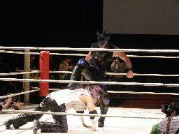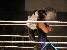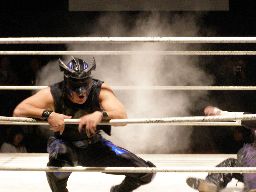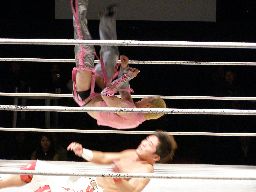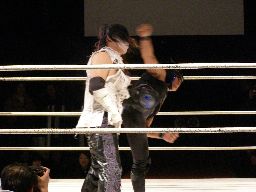 怨霊はひな壇席でフランケンシュタイナー(右写真)。間近で見たがこれは凄かった。リングに戻すとミサイルキック。5分経過。