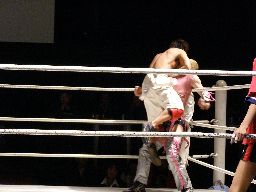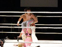 大石が入り忍をコーナーに振って串刺しエルボー(右写真)、ロープに振ってエルボー、そしてロープに飛んでのエルボードロップ、カウント2。大石フェースロック、リリースしてストンピング、旭にタッチ。旭は忍の足を攻める。5分経過。