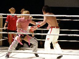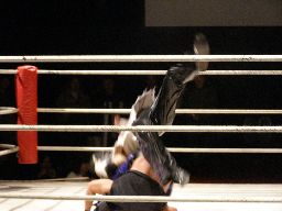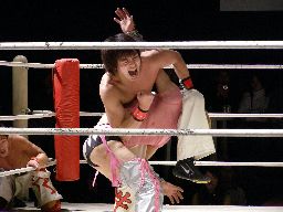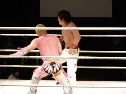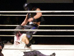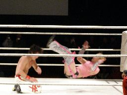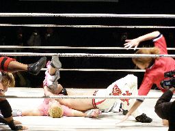 忍が入ってセックスボンバー、旭かわして逆さ押さえ込み、忍起き上がって顔面ドロップキック(右写真)。
