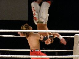 エプロンを走ってサッカーボールキック(左写真)。またダブルニー。