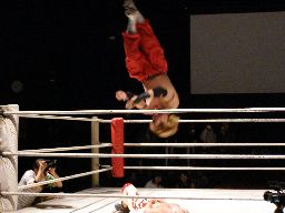 宮本ボディスラム、コーナーに上る。ムーンサルトかと思ったら1ひねりセントーン(左写真)、カバーは旭がカット。