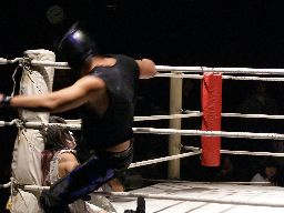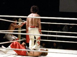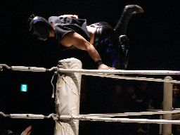 旭コーナーに上ってダイビングフットスタンプ(右写真)、忍がカット。10分経過。