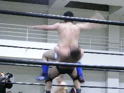 諸橋もコーナーに上るが橋本が後ろから肩車に(右写真)。東郷飛んでダブルインパクト