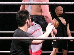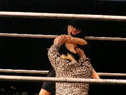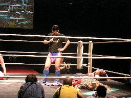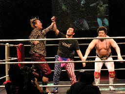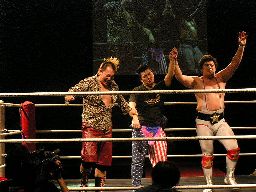 猪熊が「次回、ドラマチック三銃士のお話は、5・4後楽園ヘビトラ・コントラ・マスカラだ!」と締めると坂井と2人でディーノにバギーパンツをはかせ、両手を挙げる(右写真)