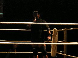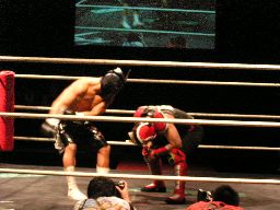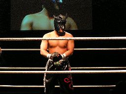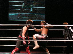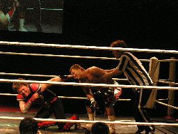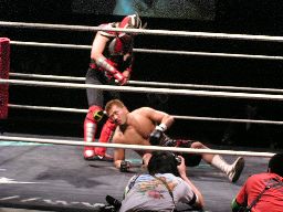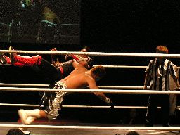 HERO!がスライディングキックで場外に落としプランチャ、ダークネスかわす。大鷲が早くも介入、売店にHERO!を投げ込む。リングに戻すとダークネスがパンチ連打(左写真)。