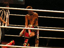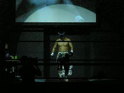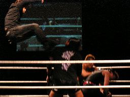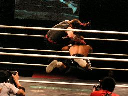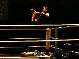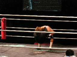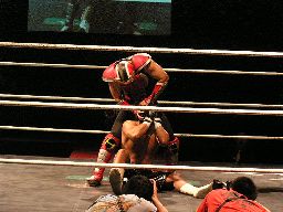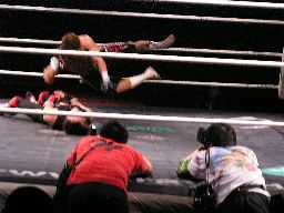 リングに戻すとジェットがロープの間を走ってエルボードロップ(右写真)。5分経過。