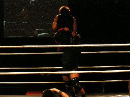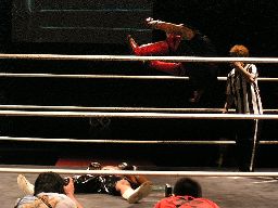 大鷲が入ってHERO!を羽交い絞め、そこにMIKAMI(私服)がスワンダイブミサイルキック(右写真)で入ってくる。