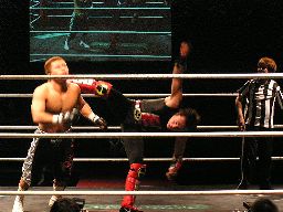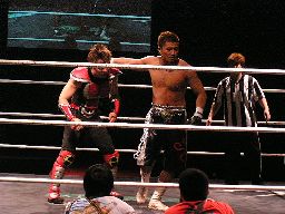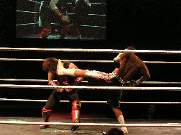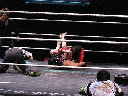 ジェットヒザ蹴り、踏みつけ、腕をひねると指に噛み付く(左写真)。場外に出すとまた大鷲が手を出す。