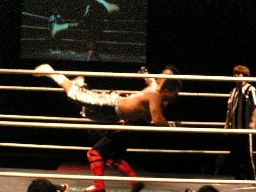 HERO!ファルコンアロー狙う、ジェット着地、バックを取る。HERO!切り返す、ジェットは急所蹴り。ジェットロープに飛んでのフライングラリアット(右写真)2連発。カウント2。
