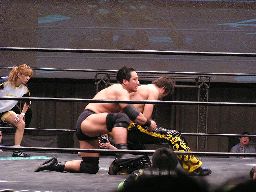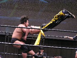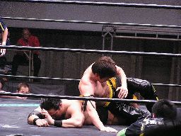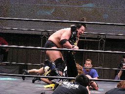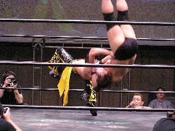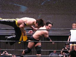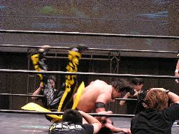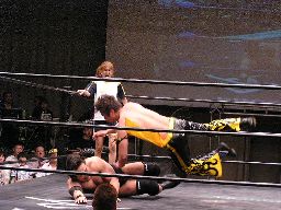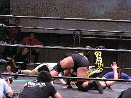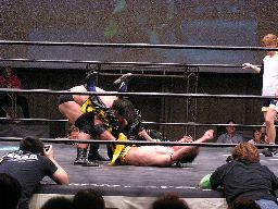 KUDOコーナーに振ってダブルニーアタック、対角線コーナーに振る、高木切り返して突っ込む、KUDOかわしてジャーマン(左写真)、カウント2。10分経過。