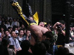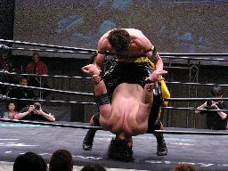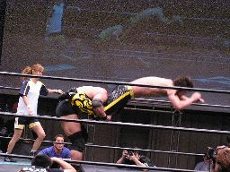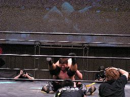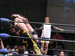 高木は場外マットをはがしてボディスラム(右写真)。高木がKUDOを客席に振るがKUDO切り返す、高木客席に一直線。