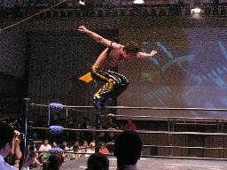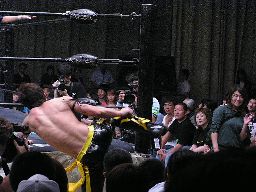ロープワークからKUDOドロップキック、ロープにもたれた高木にKUDOが突っ込む、高木かわしてKUDOを場外に放り投げる(左写真)。