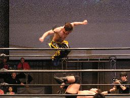 KUDOは高木を机に寝せるとコーナーからダイビングニードロップ(右写真)。リングに戻してカバー、カウント2。ロープに振ってミドルキック。