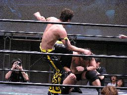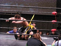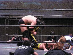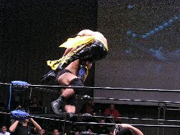 KUDOコーナーからダイビングダブルニードロップ、高木はヒザを立てて受ける(右写真)。そりゃ受けた方も痛いだろう。