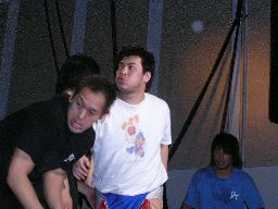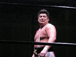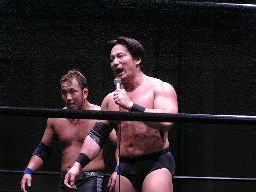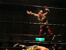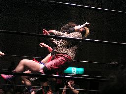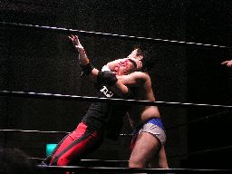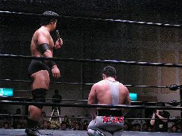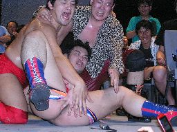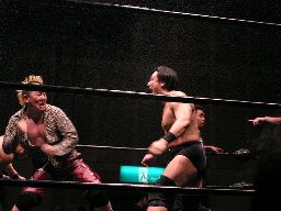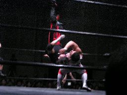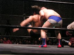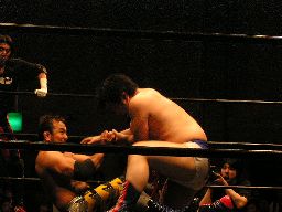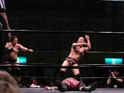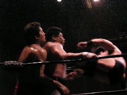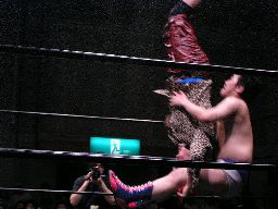 IMJブレーンバスター狙うが猪熊ブロック。諸橋入ってダブルで投げる。諸橋IMJにカニばさみ、IMJその勢いで倒れこみヘッドバット。IMJはピープルズ猪俣よっ!(右写真)、あっさりかわされる。