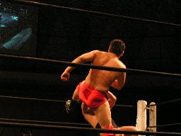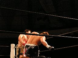 MIKAMIコーナーに振る、ジェット切り返す、MIKAMIエプロンに出てキック、コーナーに上ってミサイルキック(左写真)。MIKAMIロープに飛ぶ、HERO!がエプロンからキック。