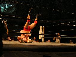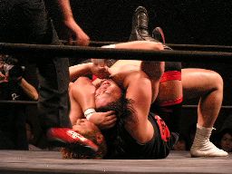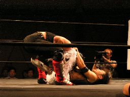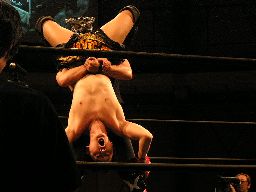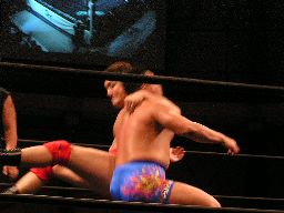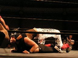 HERO!入ってハイキック、MIKAMIかわすがHERO!はすぐに2発目をヒットさせカバー、カウント2。HERO!拳にチェーン巻きつけてMIKAMIのアゴにパンチ、カバーは鳥羽がカット。MIKAMI飛びついてデュランダル(右写真)。