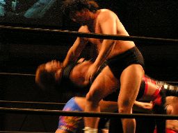 コーナーに振ってフェースクラッシャーからストラングルホールド(右写真)、橋本がカット。10分経過。