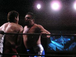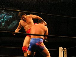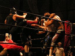 石川ロープに飛ぶ、健心カウンターのラリアット(右写真)。健心ロープに飛んでもう一発、カバーは橋本がカット。泉州が橋本を場外に出す。