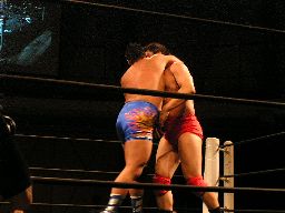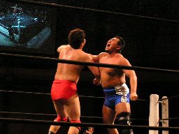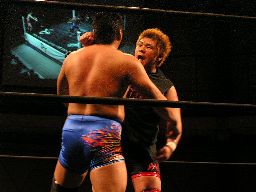 石川と健心は逆水平の打ち合い(右写真)。石川は唐竹割りを連打して橋本にタッチ。橋本首投げからサッカーボールキック。健心立ち上がって逆水平、チョップの打ち合いに。コーナーに連れ帰る、泉州入って太鼓の乱れ打ち。泉州ストンピング、逆水平。橋本ミドルキックで逆転、サッカーボールキック打ち込んで石川にタッチ。