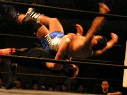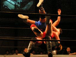 健心と石川バックの取り合い、石川がバック取ったところで橋本が入り2人まとめてジャーマンで投げる(左写真)。