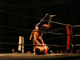 ハイジャックパイルドライバーを狙ったはずが泉州はなぜかリング中央でパイルドライバー(左写真)。