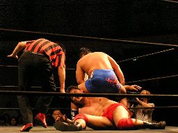 橋本スリーパー(右写真)、健心がカット。橋本ボディスラムからベイダーボム、カウント2。石川にタッチ。5分経過。