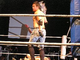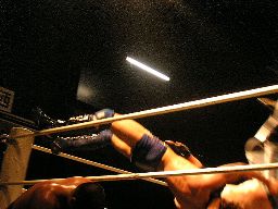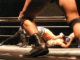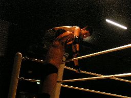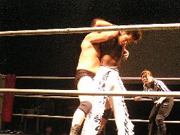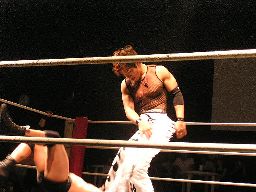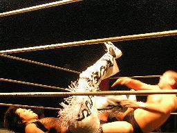 伊東が飯伏にボディスラム、ドラゴンスプラッシュを狙ってコーナーに上る、柿本が足を押さえる(右写真)。