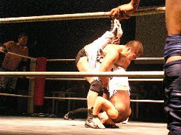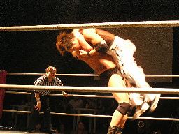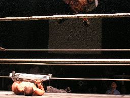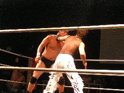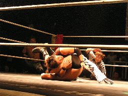 柿本エルボー連打からフライングエルボーアタック(右写真)、カウント2。