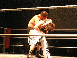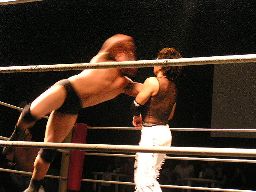 柿本ロープに飛ぶ、MIKAMIはジャンピングエアスマッシュとでもいうべき強烈な張り手(右写真)。