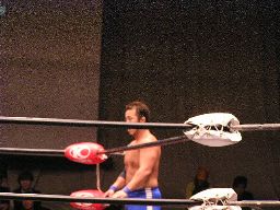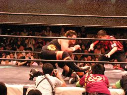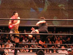 鳥羽と橋本がリングイン、蹴り合い(右写真)は橋本が制しコーナーに振って串刺しラリアット、カウント2。一宮にタッチ。