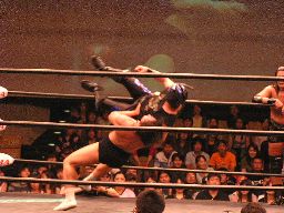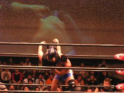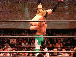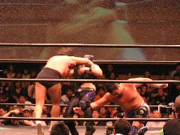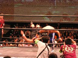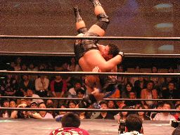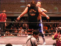 HERO!は大鷲にタッチ。大鷲ボディスラムから両足で踏みつけ、ブレーンバスターは泉州ブロックするが結局大鷲が投げる(右写真)。大鷲ギロチンドロップからカバー、カウント2。HERO!にタッチ。