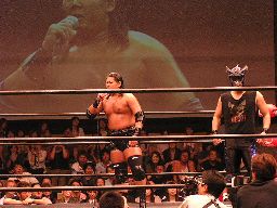 大鷲チョークスラム(左写真)、HERO!エプロンに出てスワンダイブプレス。