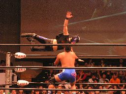 しかしHERO!がコーナーに振るとジェットと大鷲が続けざまにスプラッシュ(右写真)。HERO!がレフェリーを妨害する間に大鷲が延髄蹴り、ジェットがパンチ。