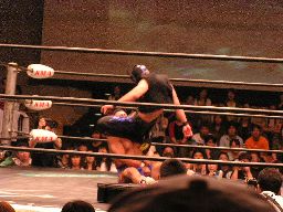 大鷲コーナーに上る、泉州が上って雪崩式ブレーンバスター(右写真)。