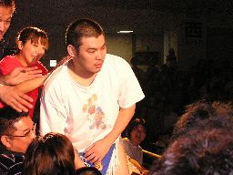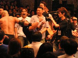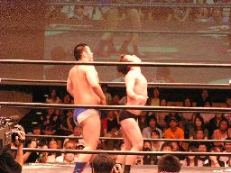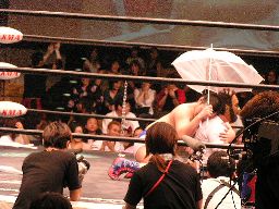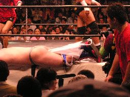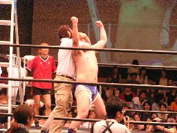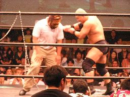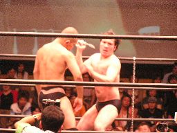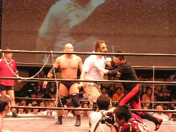 数10秒後、灯りが徐々に戻るとステージにはディック東郷が(左写真)。東郷はポイズンを殴り倒す。
